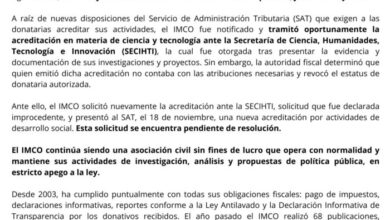 El Instituto Mexicano para la Competitividad (IMCO) informó que continuará con las acciones para recuperar su estatus como donataria autorizada,…