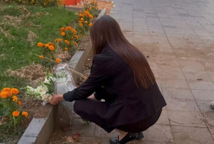 Grecia Quiroz estuvo resguardada en todo momento por elementos de la Guardia Nacional y a un costado de las jardineras colocó flores y veladoras, después de permanecer unos minutos ahí.