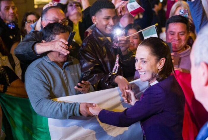 En el Hotel Catalonia ya la esperaban simpatizantes quienes la recibieron con son jarocho, porras y una manta en la que se leía: “¡Bienvenida Presidenta Claudia Sheinbaum! ¡Bienvenido humanismo mexicano!”.