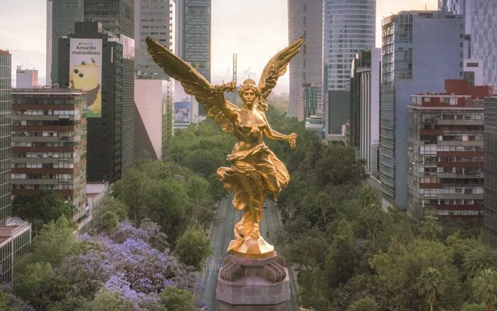 En la imagen de difusión, el Ángel de la Independencia, el monumento más visitado de la capital, aparece al centro como faro simbólico: un monumento iluminado con tonos que parecen moverse entre el violeta y el turquesa, rodeado por una retícula ondulante, como si el aire mismo se curvara con el pulso de los sintetizadores.