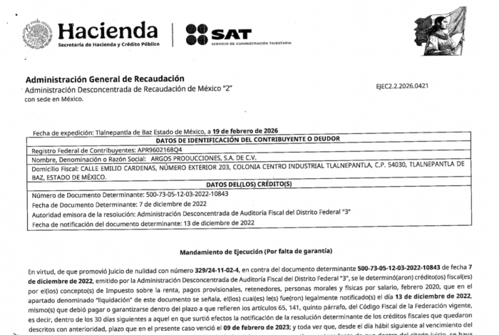 Al igual que en el caso de Argos, la empresa decidió litigar el adeudo sin respaldarlo. El resultado fue el mismo: la deuda siguió creciendo hasta que el SAT emitió un mandamiento de ejecución el 13 de marzo de 2026.