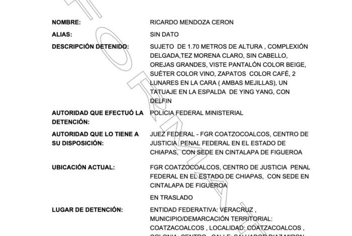El Registro Nacional de Detenciones muestra que Mendoza Cerón fue arrestado en Coatzacoalcos, Veracruz, y después llevado al Centro de Justicia Penal Federal en el Estado de Chiapas con sede en Cintalapa de Figueroa.