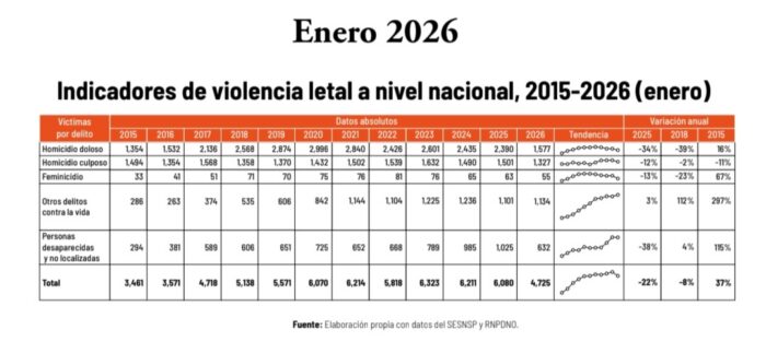 El reporte detalla que el homicidio doloso alcanzó su nivel más bajo para un mes de enero desde 2016, con una disminución de 34% frente a enero de 2025.