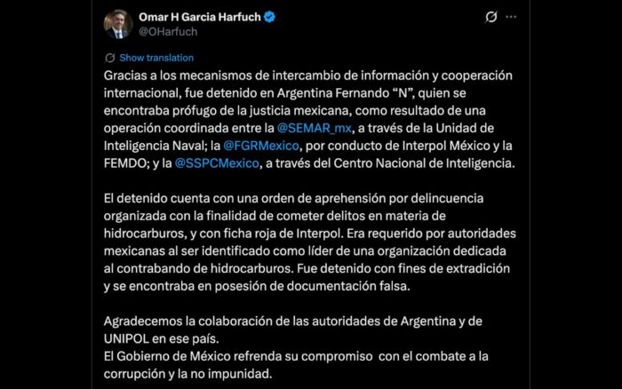 “El detenido cuenta con una orden de aprehensión por delincuencia organizada con la finalidad de cometer delitos en materia de hidrocarburos, y con ficha roja de Interpol. Era requerido por autoridades mexicanas al ser identificado como líder de una organización dedicada al contrabando de hidrocarburos“, publicó García Harfuch en su cuenta oficial de X.