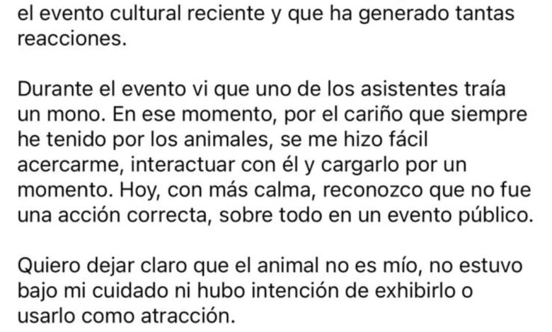 En sus redes sociales, Silvia Iliana Villarruel explicó que el mono araña no era suyo. Afirmó que el ejemplar era de una persona que asistió al evento cultural.