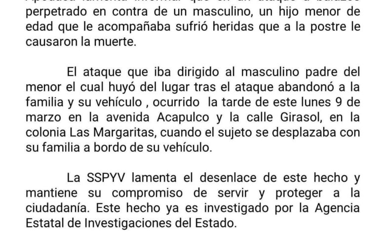 Un ataque a balazos dirigido contra un hombre provocó la muerte de su hijo de 6 años la tarde de este lunes 9 de marzo en la colonia Las Margaritas, en el municipio de Apodaca, estado de Nuevo León.