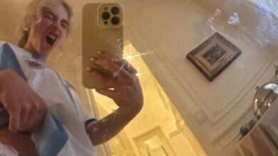 Sabrina Carpenter posó en bombacha con la celeste y blanca desde su hotel en Argentina, en la previa de Lollapalooza