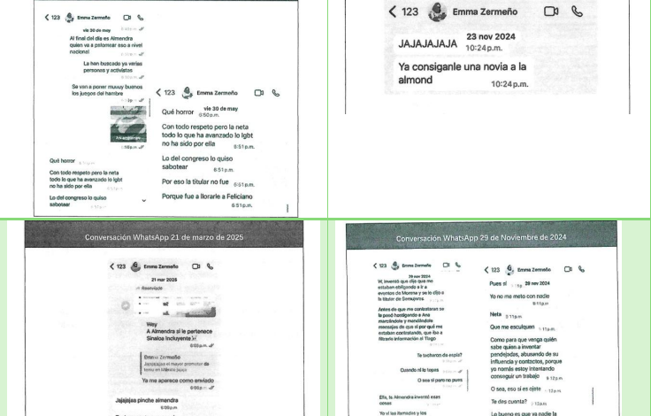 Durante 2024 y 2025, Emma Zermeño sostuvo conversaciones privadas a través de WhatsApp con un amigo. En estos mensajes, presuntamente realizó expresiones en las que afirmaba que la diputada no trabajaba, que los logros de la comunidad LGBTTTIQNB+ no eran producto de su esfuerzo, y que había accedido a su cargo partidario únicamente por ser “la única mujer y lesbiana disponible”.