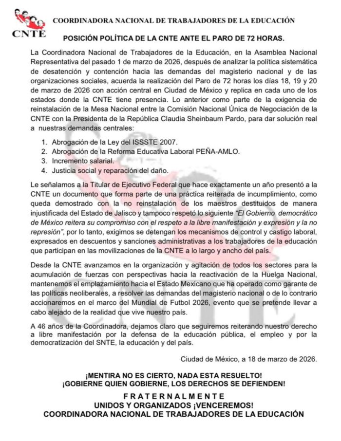 La Coordinadora exige una pensión digna para los maestros y trabajadores de la educación, así como la abrogación de la Ley del ISSSTE del 2007 junto con la Reforma Educativa Laboral Peña-AMLO, al igual que un incremento salarial.
