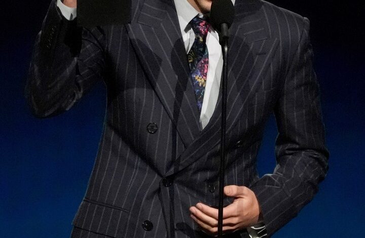 Jacob Elordi, sin maquillaje ni prótesis, acepta su premio por "Frankenstein". Foto APJacob Elordi, sin maquillaje ni prótesis, acepta su premio por “Frankenstein”. Foto AP