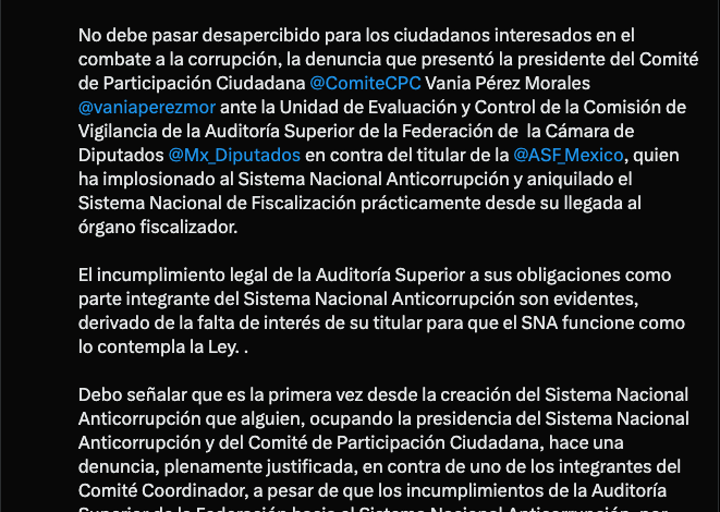 Vania Pérez Morales, presidenta del Sistema Nacional Anticorrupción, informó que presentó una denuncia en contra de David Colmenares, titular de la Auditoría Superior de la Federación (ASF).