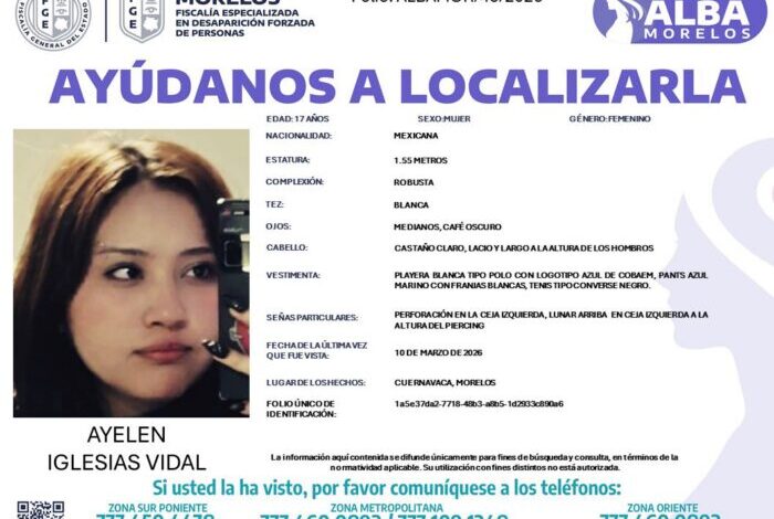 Ayelen Iglesias Vidal, estudiante del Colegio de Bachilleres del Estado de Morelos (Cobaem), fue reportada como desaparecida desde el 10 de marzo.