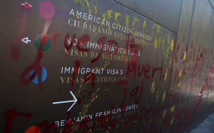El pasado sábado se registraron manifestaciones frente a la sede diplomática, donde también se reportaron actos de vandalismo en la fachada de la embajada, mientras elementos de seguridad contuvieron a los manifestantes en la zona.