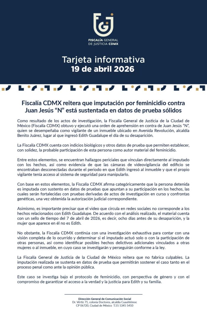 La Fiscalía de la Ciudad de México rechazó este domingo haber fabricado culpables y defendió las pruebas que sustentan la detención del presunto feminicida de Edith Guadalupe Valdés, en un caso que ha generado críticas por la actuación de las autoridades desde la desaparición de la víctima.