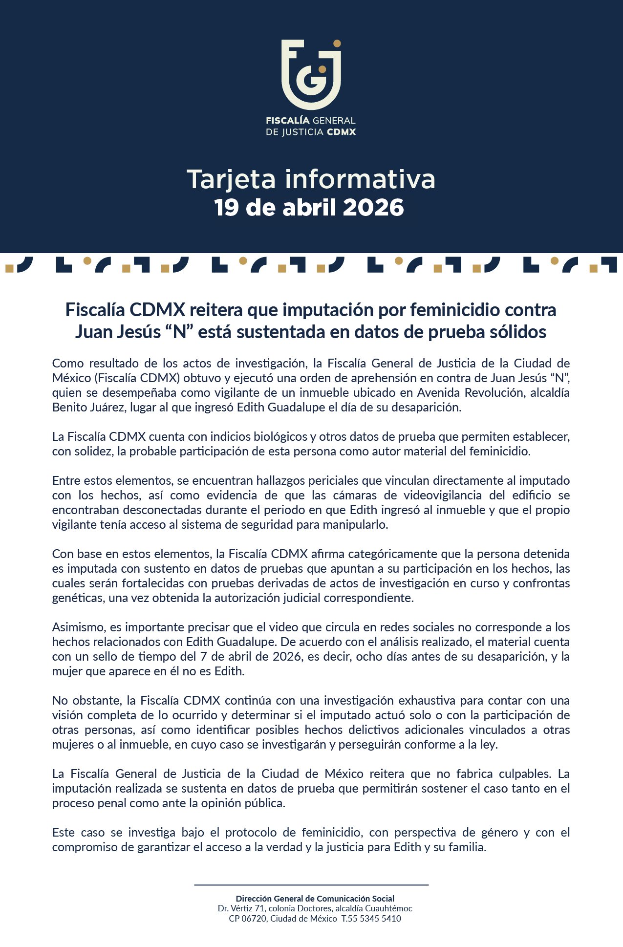 La Fiscalía General de Justicia de la Ciudad de México reitera que no fabrica culpables. La imputación realizada se sustenta en datos de prueba que permitirán sostener el caso tanto en el proceso penal como ante la opinión pública.