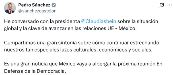 El pronunciamiento se difundió después de que Sánchez informara sobre su encuentro con Sheinbaum, en el que abordaron la situación global y la relación entre México y la Unión Europea.