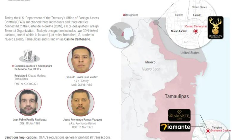 - Establecimientos señalados: La OFAC designó al Casino Centenario (Nuevo Laredo) y al Diamante Casino (Tampico) como piezas fundamentales en la estructura financiera del cártel.
