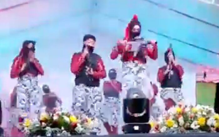 Al final del baile escolar, las y los estudiantes reprodujeron un fragmento del Plan Michoacán por la Paz y la Justicia presentado por la presidenta Claudia Sheinbaum.