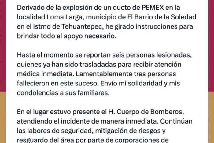 Tres personas fallecieron y seis más resultaron heridas tras una explosión e incendio de un ducto de Petróleos Mexicanos (Pemex), ubicado en Loma Larga, municipio de El Barrio de la Soledad, confirmó el gobernador del Estado de Oaxaca, Salomón Jara Cruz.