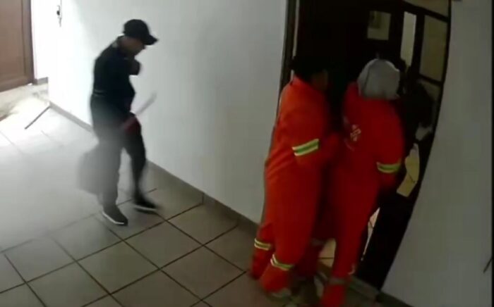 El video muestra que, cuando la víctima abrió la puerta del domicilio, uno de los sujetos que vestía uniforme naranja simulando ser trabajador de limpia la sometió por la espalda con un arma de fuego y la obligó a ingresar a la vivienda.
