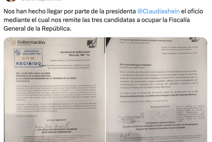 “Envío, con firma de la Presidenta de la República, el Comunicado por el que se somete a consideración del Senado de la República la terna a ocupar el cargo de la persona titular de la Fiscalía General de la República, en hojas P.R.17; con el fin de que, por su conducto, sea presentado al órgano legislativo referido, para su designación, en cumplimiento a lo dispuesto en el artículo 102, apartado A, fracción II, de la Constitución Política de los Estados Unidos Mexicanos.