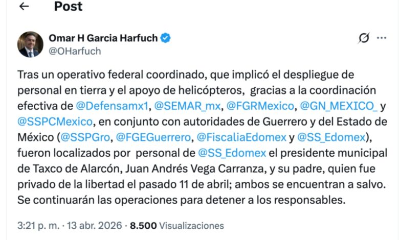 El Secretario de Seguridad y Protección Ciudadana, Omar García Harfuch, informó que en el operativo de fuerzas federales participaron personal en tierra y helicópteros, por lo que el alcalde de la ciudad guerrerense y su padre ya “se encuentran a salvo”.