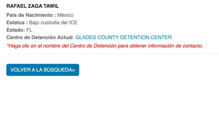 De acuerdo con el portal de ICE, Zaga Tawil se encuentra en el Centro de Detención del Condado de Glades, ubicado en Florida, mismo en el que recientemente murió un joven mexicano de 19 años.