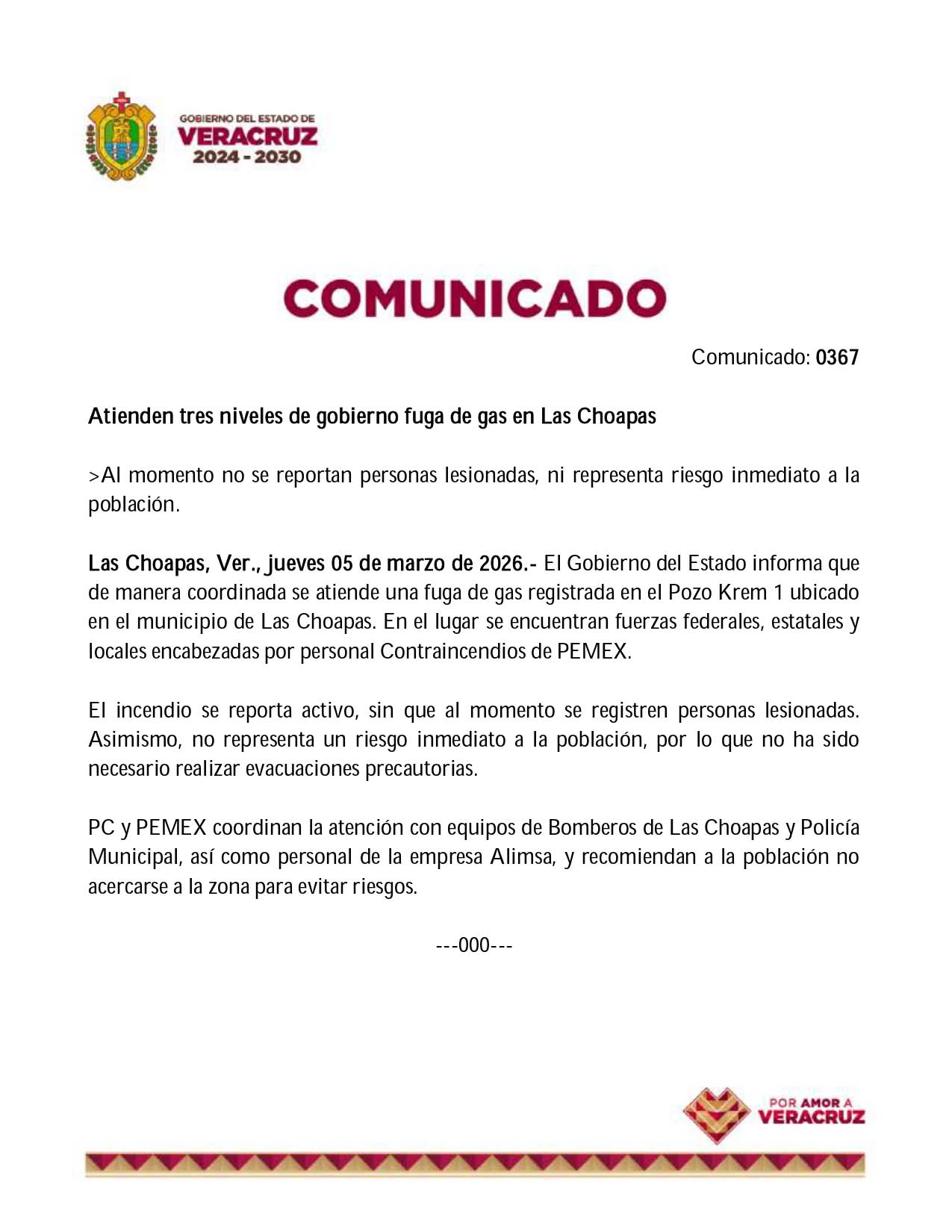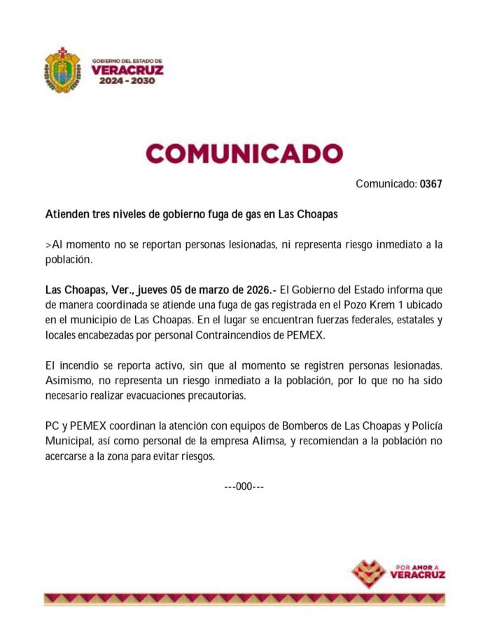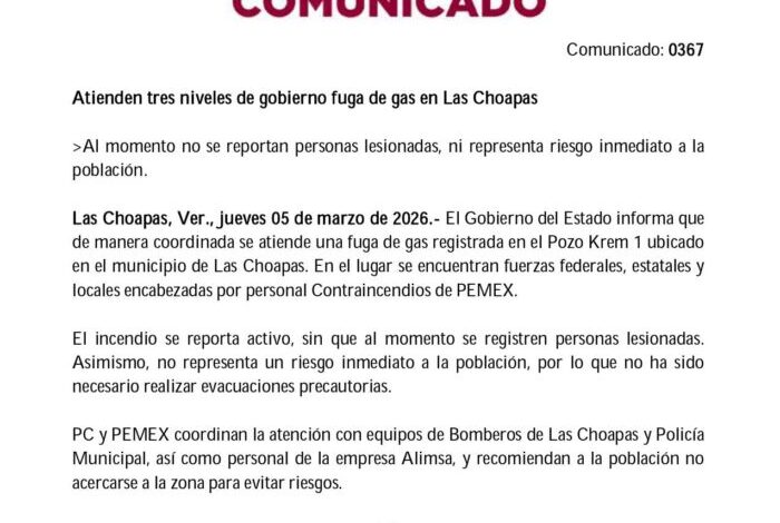 PC y PEMEX coordinan la atención con equipos de Bomberos de Las Choapas y Policía Municipal, así como personal de la empresa Alimsa, y recomiendan a la población no acercarse a la zona para evitar riesgos
