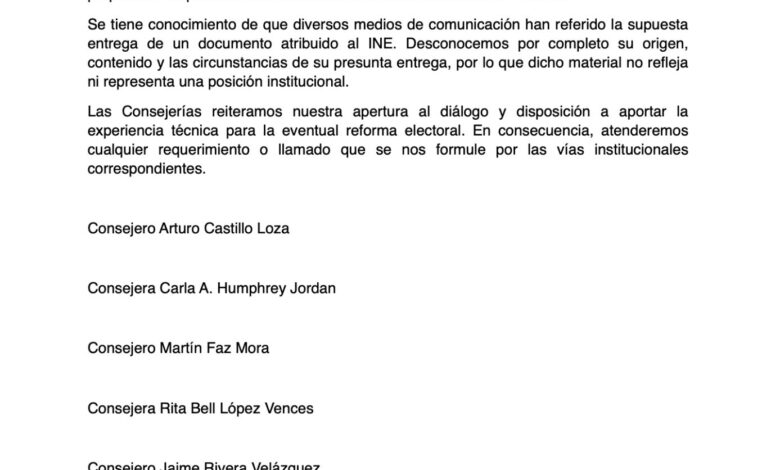 Este martes, siete consejeros emitieron un comunicado para desconocer tal documento, ya que el Consejo General del INE “no ha emitido observaciones ni propuestas respecto de la iniciativa de reforma conocida como ‘Plan B’”.