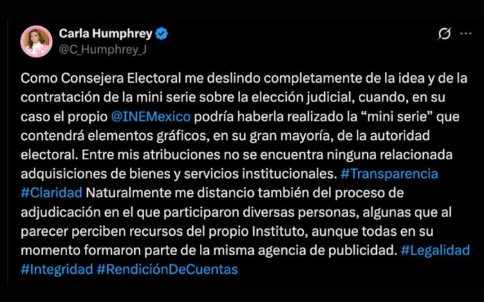 A través de su cuenta en la red social X, la consejera Carla Humphrey cuestionó la necesidad de realizar tal documental fuera de la institución: “Como Consejera Electoral me deslindo completamente de la idea y de la contratación de la mini serie sobre la elección judicial, cuando, en su caso el propio INE podría haberla realizado”.