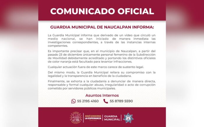 Asimismo, el gobierno local recordó que en Naucalpan solo personal femenino acreditado y portando distintivos oficiales color naranja está acreditado para levantar infracciones.