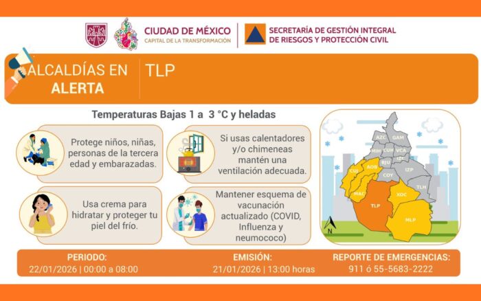 La Secretaría de Gestión Integral de Riesgos y Protección Civil de la Ciudad de México emitió una serie de avisos preventivos ante el pronóstico de bajas temperaturas que afectarán a diversas alcaldías durante las primeras horas del jueves 22 de enero.