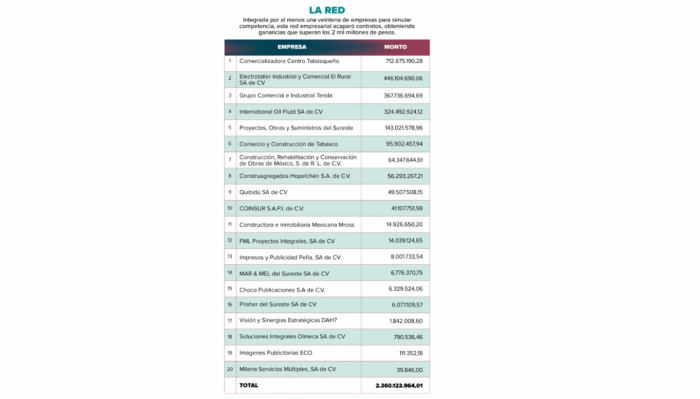 La red, integrada por al menos 20 empresas, ha obtenido contratos que superan los 2 mil 360 millones de pesos en Tabasco, Campeche, Chiapas, Hidalgo, Puebla y Quintana Roo, así como en dependencias federales, con presencia destacada en Conagua y Segalmex, en la que ocurrió el mayor caso de corrupción en el sexenio de López Obrador