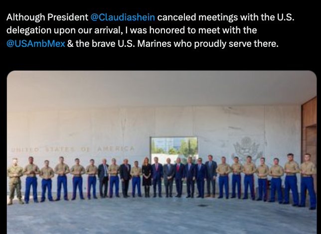 Tuve el privilegio de visitar la Ciudad de México junto con el legislador Michael McCaul. Aunque la presidenta Claudia Sheinbaum canceló las reuniones con la delegación estadounidense a nuestra llegada, tuve el honor de reunirme con la Embajada de Estados Unidos y los valientes infantes de marina estadounidenses que sirven allí con orgullo.