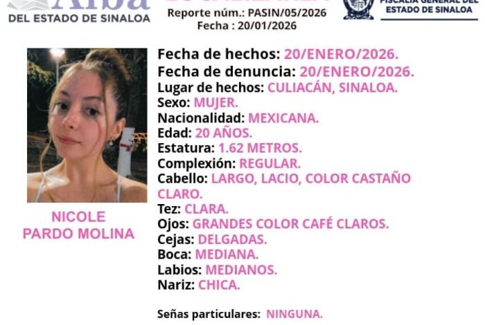 Posteriormente, la Fiscalía General del Estado de Sinaloa emitió una ficha de búsqueda a nombre de Nicole Pardo Molina, en la que se detallaba que al momento de su desaparición vestía blusa morada, pantalón negro, huaraches y un moño negro, vestimenta que coincide con la observada en la grabación difundida.