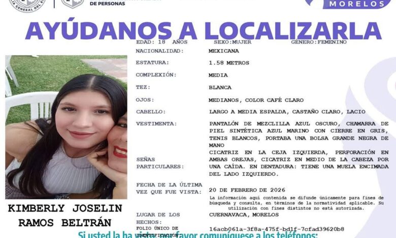El cuerpo de Kimberly Jocelin Ramos Beltrán, estudiante de la Universidad Autónoma del Estado de Morelos (UAEM) que estaba desaparecida desde el pasado 20 de febrero, fue localizado sin vida en un predio boscoso cercano al campus Chamilpa, confirmaron autoridades judiciales.
