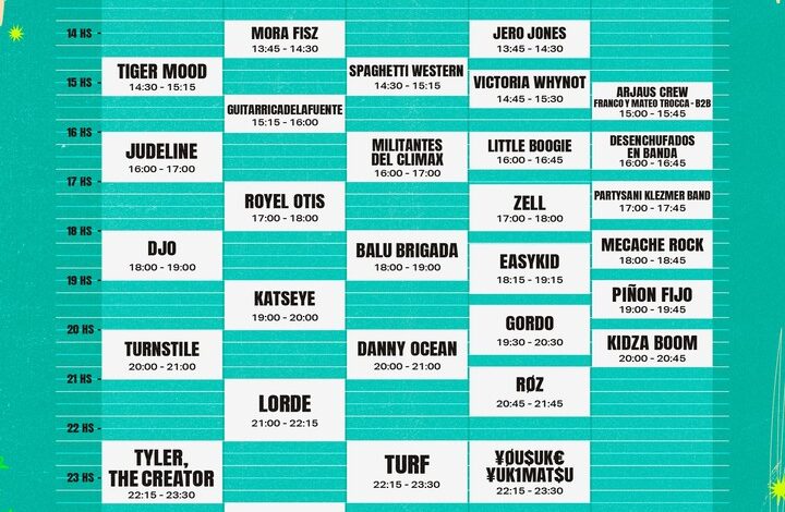 Escenario FLOW: Tiger Mood, de 14.30 a 15.15. Judeline, de 16.00 a 17.00. DJO, de 18.00 a 19.00. Turnstile, de 20.00 a 21.00. Tyler, The Creator, de 22.15 a 23.30.
