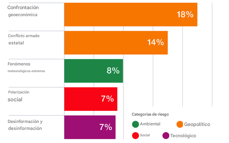 Según la encuesta aplicada a mil 300 expertos a nivel internacional, los principales riesgos globales detectados son: Confrontación geoeconómica, Conflicto armado de Estado, Eventos climáticos extremos, Polarización social y Desinformación.