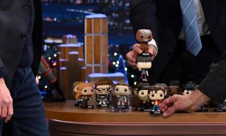 En el segmento, los hermanos Duffer colocaron las figuras en posiciones simbólicas sobre el escritorio de Fallon. Barb, muerta desde la primera temporada, quedó en el suelo para confirmar que no regresará. Eleven fue sumergida en un vaso de agua, aludiendo posiblemente a un tanque de aislamiento sensorial.