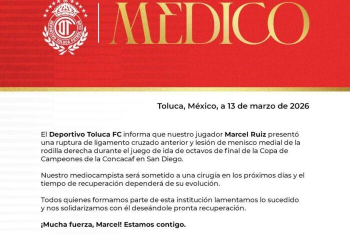 “El Deportivo Toluca informa que nuestro jugador Marcel Ruiz presentó una ruptura de ligamento cruzado anterior y lesión de menisco medial de la rodilla derecha. Nuestro centrocampista será sometido a una cirugía en próximos días y el tiempo de recuperación dependerá de su evolución”, fue el mensaje que emitió el Toluca.