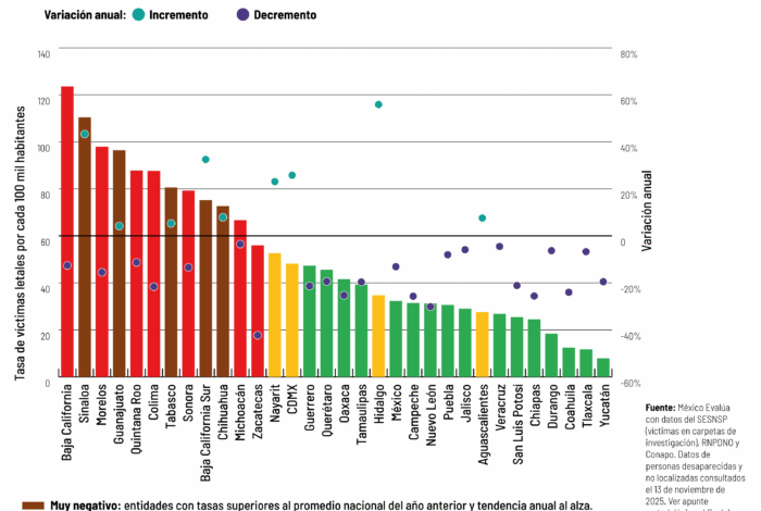 “Las estrategias implementadas en los estados donde la violencia se agrava parecen encontrarse estancadas o resultar ineficaces para contener la escalada criminal”, señala México Evalúa y destaca que 16 entidades presentan condiciones preocupantes de violencia letal.