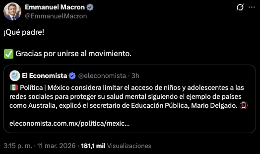 Una de las reacciones a esta declaración vino del presidente francés, Emmanuel Macron, quien comentó “¡Qué padre! ✅ Gracias por unirse al movimiento”, al mencionar una nota de El Economista con la información de AFP.