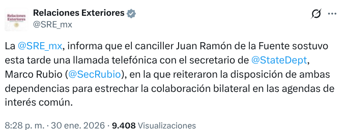 Por su parte, un comunicado oficial del Departamento de Estado —atribuible al portavoz adjunto principal, Tommy Pigott— indicó que Rubio conversó con De la Fuente sobre “el avance de las prioridades compartidas y la seguridad regional”, sin ofrecer más detalles sobre temas específicos abordados.
