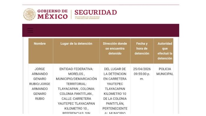 Según el Registro Nacional de Detenciones de la Secretaría de Seguridad y Protección Ciudadana, el aseguramiento ocurrió el 25 de abril de 2026 a las 21:55 horas, sobre la carretera Yautepec–Tlayacapan, a la altura del kilómetro 10, en la colonia Pantitlán, municipio de Tlayacapan. La aprehensión fue realizada por elementos de la policía municipal.