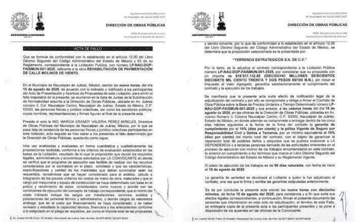 El ayuntamiento de Naucalpan de Juárez, Estado de México, otorgó un contrato de más de 18 millones y medio de pesos a la empresa Terrenos Estratégicos S.A. de C.V. para la rehabilitación de pavimentación de la calle Molinos de Viento. Esta compañía concursó junto con Alianza Comercialización y Construcciones S.A. de C.V. en la licitación. Ambas están vinculadas a través de apoderados, representantes legales y otras razones sociales.