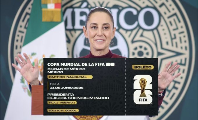 El concurso se llama ‘Representa a México en la inauguración del Mundial’. ¿Con qué boleto? Con el boleto de la presidenta. Es este boleto. El 00001. Yo voy a estar aquí en el Zócalo con la gente viendo la inauguración. Mientras una joven me va a representar en la inauguración.