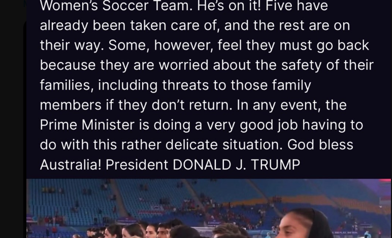 “Australia está cometiendo un terrible error humanitario al permitir que obliguen a la selección nacional femenina de futbol de Irán a regresar a Irán, donde muy probablemente serán asesinadas. No lo haga, señor primer ministro, concédales ASILO”, dijo Trump en un mensaje en su red Truth Social dirigido al primer ministro Anthony Albanese.