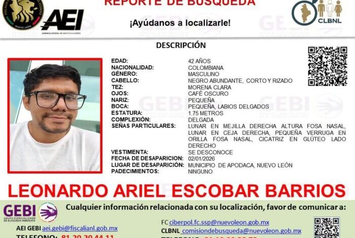 El profesor Leonardo Ariel Escobar Barrios de la Universidad Iberoamericana Puebla fue presuntamente detenido el pasado 31 de diciembre de 2025, y fue reportado desaparecido desde el pasado 2 de enero en Apodaca, Nuevo León.