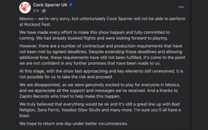 Hasta el mediodía de este viernes 17 de abril, horas después de que Cock Sparrer anunciara su cancelación, Rockout MX no ha publicado un comunicado oficial para ofrecer explicaciones. Su post más reciente es una imagen presumiendo que supuestamente los boletos V.I.P., cuyo costo asciende a 5,175 pesos, están por agotarse.