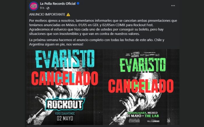 Durante la madrugada del viernes 3 de abril, La Polla Records anunció que todas las fechas de Evaristo en México serán canceladas, incluyendo la de Guadalajara del 1 de mayo y la del Rockout del 2 de mayo.